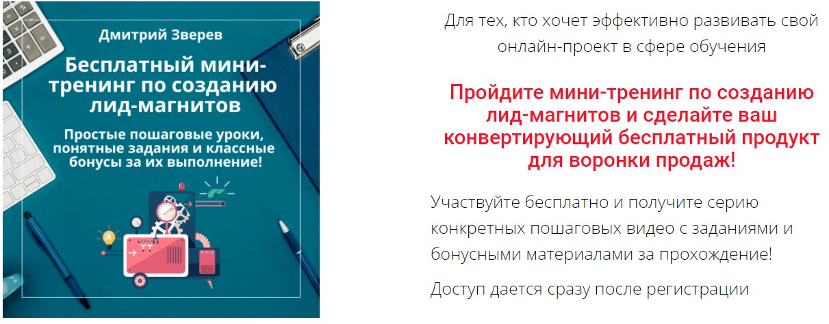 Пример инфопродукта такого формата – мой тренинг по созданию, как раз-таки, лид-магнитов.