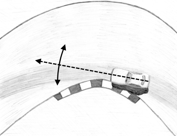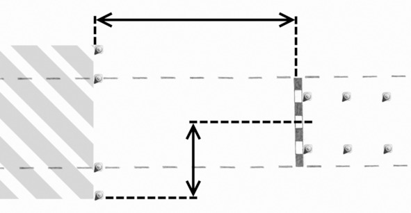 Along the strip of cones we will accelerate the car. After we achieve fixed speed (in this case, we will gain speed of 75 km/h), we will move strictly straight along the strip of cones to the vertical marking, without taking any action. As soon as we achieve the line, our hands will be untied, we will be able to perform any actions with the controls. Shaded area – is an area where may be obstacles. Hitting the shaded area or turn the car around will be considered as a failure. We need to avoid sector of expected location of obstacles and stop. Let us call this test “understeer test”.