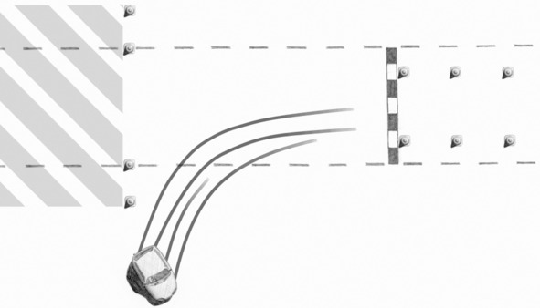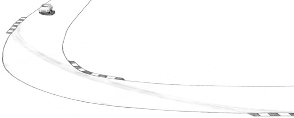 Exercise 7. Place cones on a ground that simulate a corner. Make long distance behind the cones, ensuring safe exit from the corner. Enter corner at speed at which the front wheels slide and car go out of the corner. With help of previously practiced techniques, extinguish speed at entrance to the corner to overcome slide of the front axle.