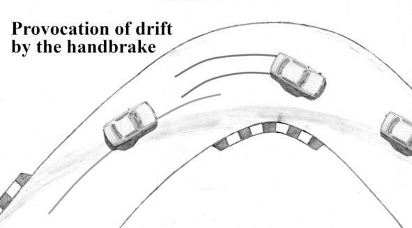 c) Drifting of the rear wheels on rear-wheel drive car can be caused by following method: press the clutch pedal, press the throttle pedal and gain high engine speed, then depress the clutch pedal without depressing the throttle pedal. After that, if engine torque is enough and it is sufficiently inert, the rear wheels should start slipping and the rear axle begin drifting. This technique can be used if there is shortage of engine torque or time to perform reception b).