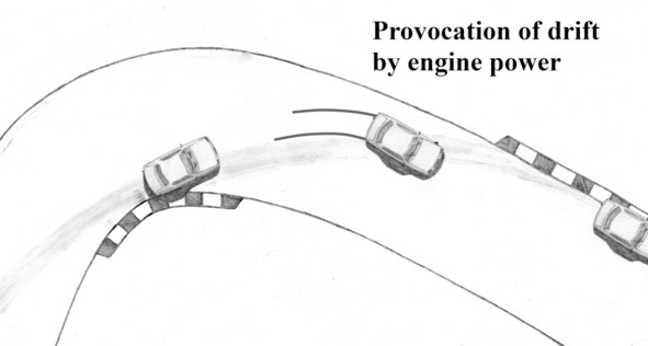 b) A small slide of the front axle that occurs at exit of a corner can be extinguished by sharply pressing of the throttle pedal (this is used for a rear-wheel drive car only, sufficiently high engine torque is required).