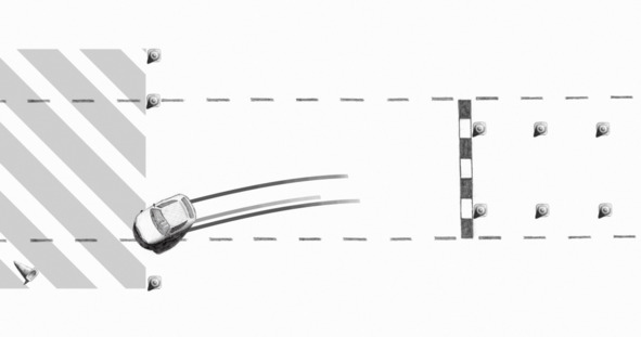 Consider the demonstration of understeer on example of emergency maneuvering, this is relevant for city conditions. Let us say that obstacle has appeared in our path while we are moving. Our task is to avoid obstacle and come to the stop without incident. To simulate such situation, we will use a test in the form of special markings and placed cones on the test ground.