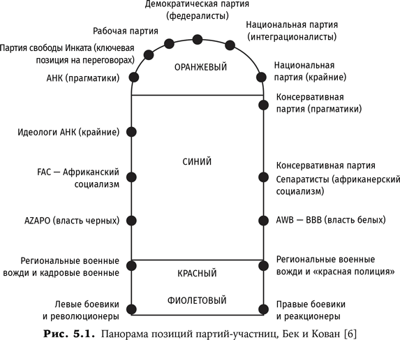 Бек попытался разработать решение дилеммы ЮАР под лозунгом «один за всех», то есть под девизом ЖЕЛТОГО мира. Бек считал, что важно заострить внимание на процессах принятия решений, которые будут протекать за «столом переговоров ЮАР» [7]. Таблица 5.1 показывает разнообразие, которое до пор существует в Радужной стране.