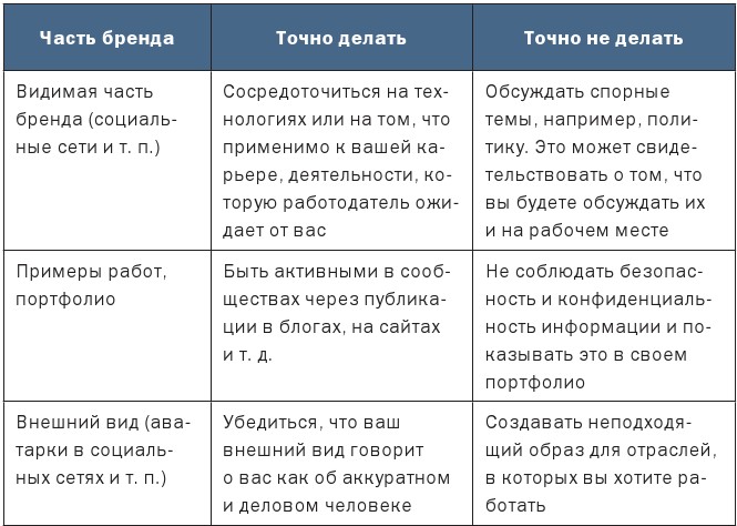 Личный бренд рассказывает потенциальному работодателю о вас и о том, что от вас можно ожидать. Он строится вокруг вас: от личного общения или слухов о вас до социальных сетей, проектов с открытым исходным кодом и веб-сайтов с вопросами и ответами, в которых вы участвуете, – в основном с использованием всей информации онлайн и офлайн. Личный бренд помогает работодателю понять, что вы сможете привнести в рабочее пространство, а потому необходимо убедиться, что он отображает ваши истинные намерения.