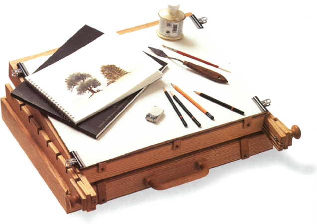 A metal easel is light in weight but stable enough for working on location. I work with the board fairly upright, which discourages the use of excess water. You should be able to tilt the board to a horizontal position when required to control the movement of wet paint. Painting boxes also provide a useful easel. A low-cost alternative is to use wooden blocks to slope the backing board.