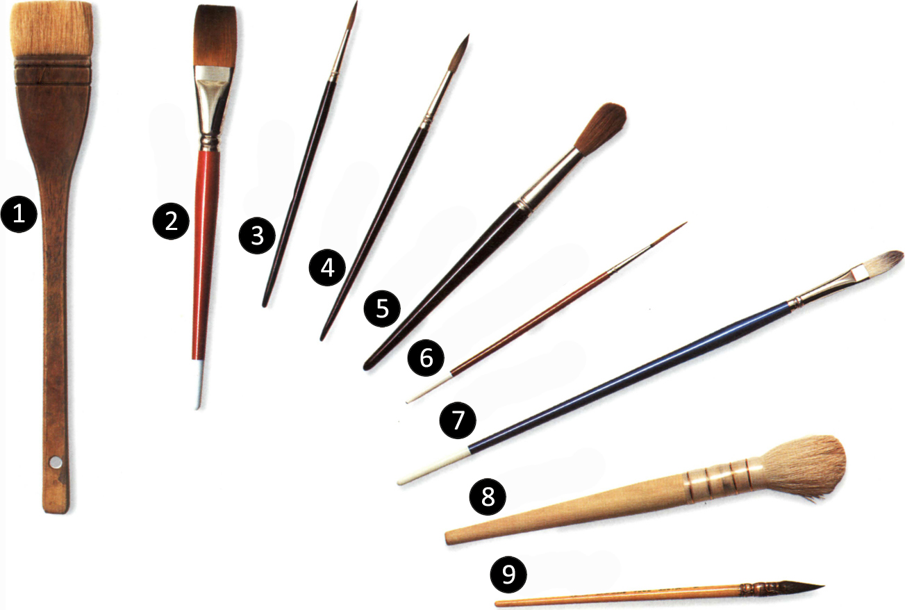 1. Hake 2. 1 in flat brush 3. Round No.5 4. Round No.8 5. Large round sable 6. Long-haired size 1 rigger 7. Filbert hog brush 8. Goat-hair mop 9. Squirrel brushWatercolour paper
