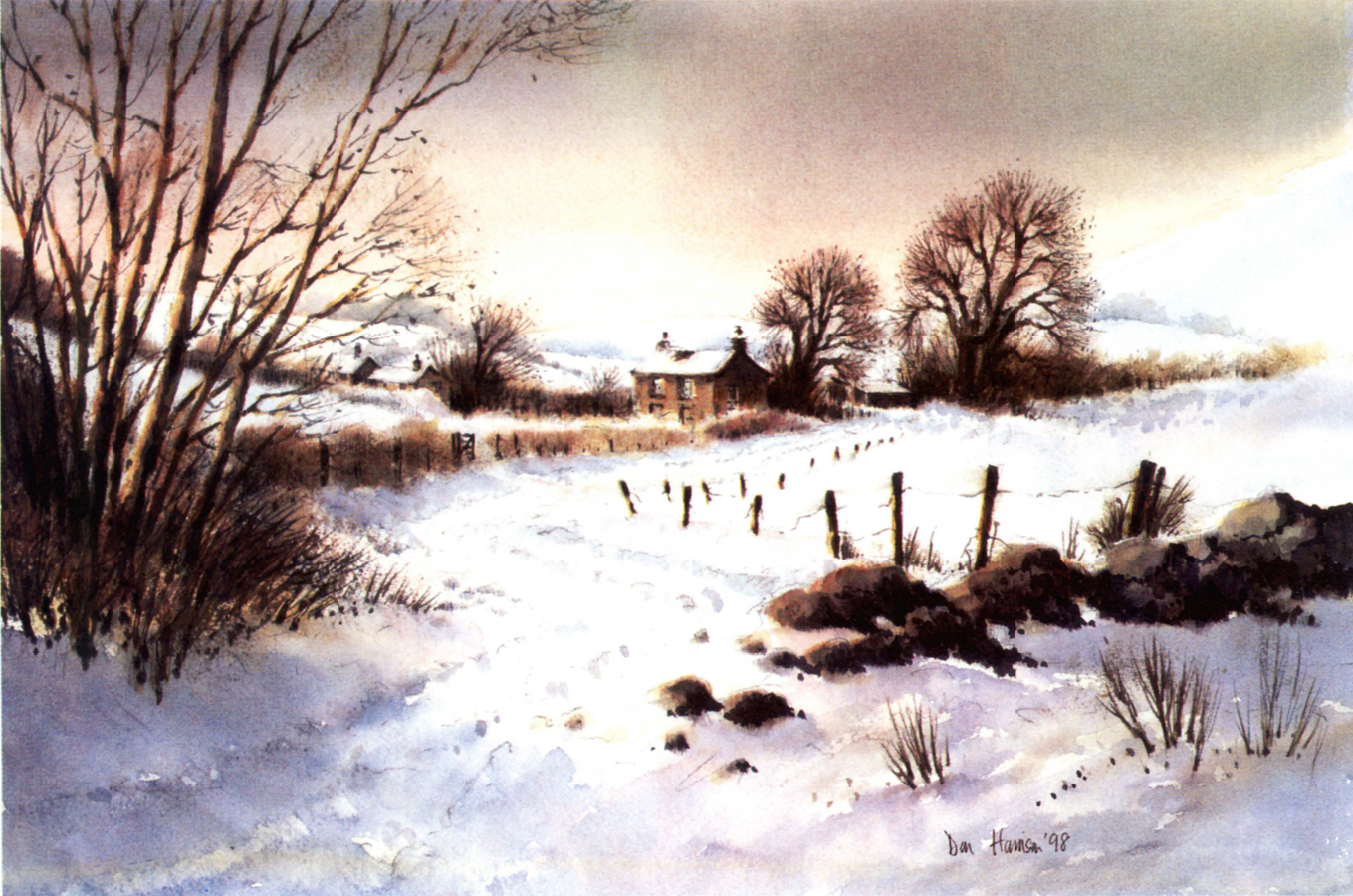 The heavy overcast sky provides just the right backdrop to the distant snow-covered fields and is painted using the same cold blues and violets that are used for the snow-bound lane and fields. These wintry colours contrast well with the rich, warm browns in the hedges and trees.