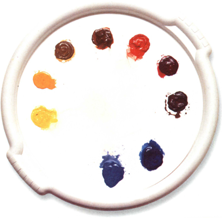 My preferred option is a circular plastic palette, offering ample space for mixing and room to fit the colours round the edge. If you arrange them in a set position, it is a simple matter to locate the colours easily without having to think where they are each time. You can use alternatives to this type of palette – for example, an enamel plate or a plastic butcher’s tray. But the important point is to have a large mixing area.