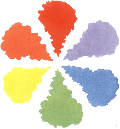 Each secondary colour, having been mixed from two of the primary colours, is usually referred to as the complementary colour of the other primary. Thus the complementary colour of red is green (a mixture of the other two primaries), the complementary colour of yellow is violet and the complementary colour of blue is orange. So what, I hear you ask? The useful point to remember is that placing complementary colours next to each other makes each of them stand out vividly. On the other hand, mixing all three primary colours together in roughly equal amounts results in dark grey or muddy colours and should be avoided.