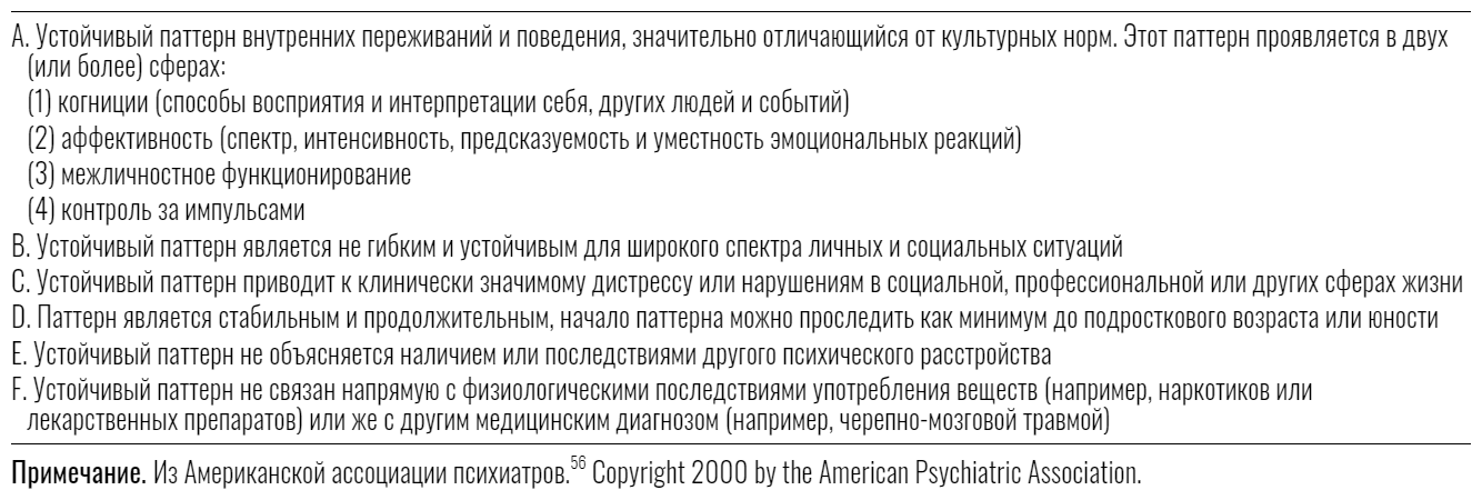 Расстройства личности представляют собой хронически дисфункциональные взгляды на мир, себя и своего партнера, сопровождающиеся чувствами и поведением, нетипичными для родной культуры. Однако РЛ являются и гомеостазными системами, в которых эмоции, когниции и поведение взаимно усиливаются и поэтому поддерживают и стабилизируют друг друга. Диагностические критерии РЛ согласно четвертому изданию Диагностического и статистического руководства по психическим расстройствам (DSM–IV-TR) представлены в таблице 1.2.