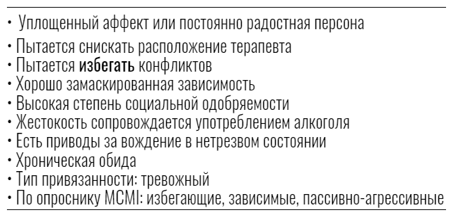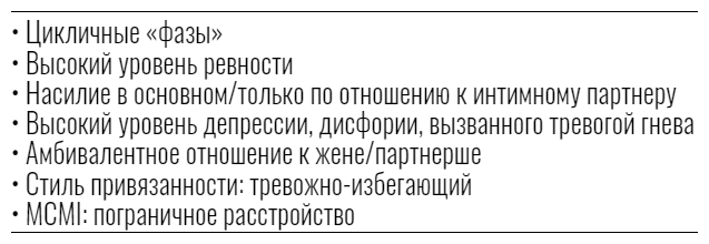 Сходная с пограничной организацией личности и имеющая клинические признаки импульсивности и гиперэмоциональности в близких отношениях описанная в данной работе абьюзивная личность кажется более родственной импульсивным насильникам, или Типу 2. Твид и Даттон45 доказали это сходство: в исследовании импульсивные мужчины получили 75 баллов по шкале ПОЛ (показатель, идентичный значениям, указанным Олдхэмом и др. для пограничного расстройства46), а инструментальные и контролирующие абьюзеры имели намного более низкие показатели по этой шкале.