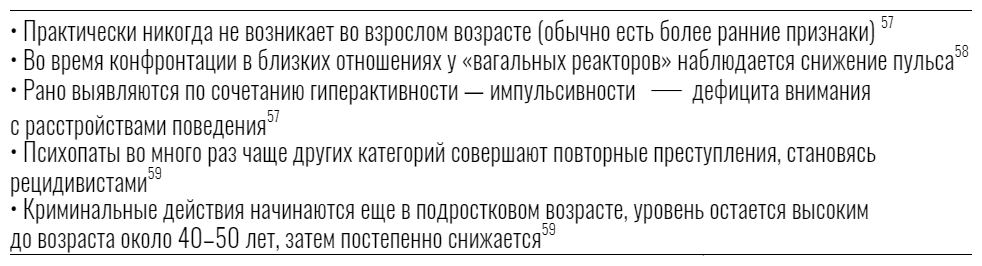 Клинические признаки недвусмысленно указывают на то, что, скорее всего, в подгруппу «вагальных реакторов» вошли психопаты. Психопаты, способные нарушать закон без каких-либо угрызений совести и не получающие пользы от терапии, знамениты высоким уровнем рецидивов даже после прохождения курса лечения.39, 40 Действительно, их уплощенные эмоциональные реакции в сочетании с изощренными техниками контроля и расчетливым применением насилия (заранее продуманным для получения противозаконной выгоды) служат двумя основными критериями, описанными в классической работе о психопатах Роберта Хаэра41 (см. таблицу 1.4). Хаэр характеризует психопатов как людей, лишенных совести, и использует магнитно-резонансную томографию (МРТ) мозга для того, чтобы продемонстрировать полное отсутствие у них эмоциональной реакции.