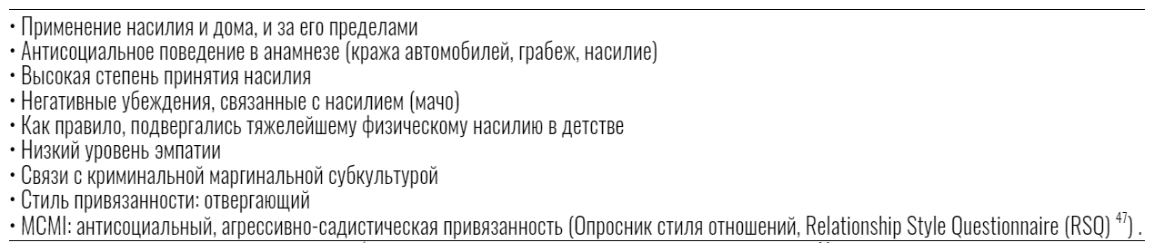 Результаты других исследований говорят о том, что среди мужчин, нападавших на своих жен21–24 – как направленных на терапию по решению суда, так и обратившихся за помощью добровольно, – процент наличия расстройств личности составляет 80–90 %, притом, что средняя частота расстройств личности у населения варьируется в пределах 15–20 %.25 По мере того как насилие становится более тяжелым и хроническим, вероятность наличия психопатологии достигает 100 %.26