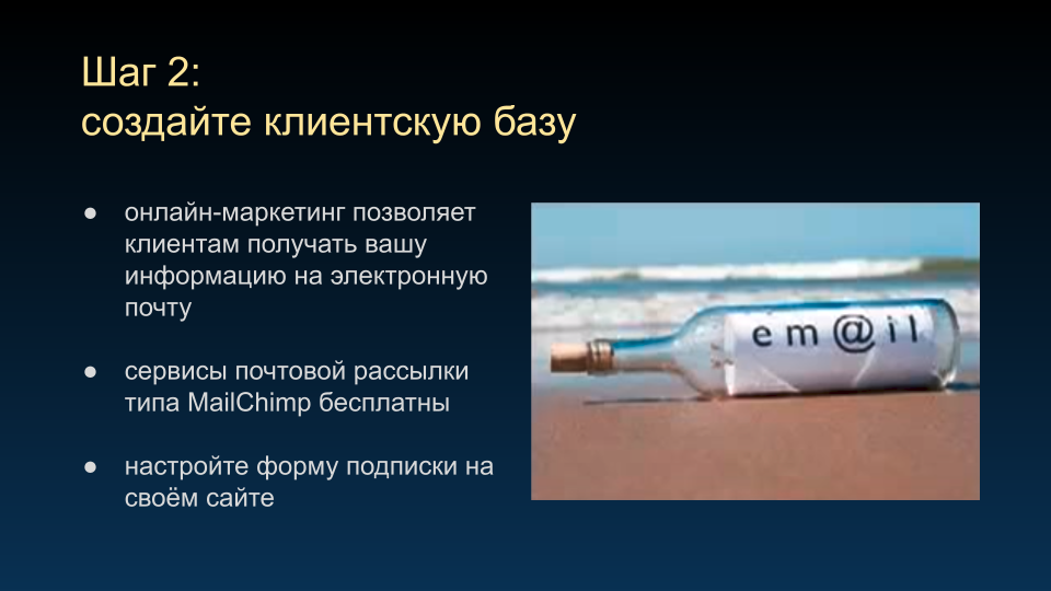 Начните собирать адреса электронной почты клиентов для почтовой рассылки, – это крайне важно, т.к. является долгосрочной инвестицией в ваш бизнес.