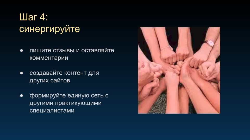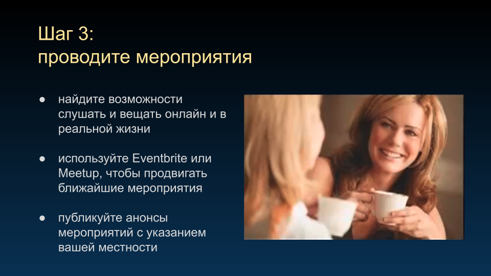 Некоторые люди анонсируют события в группах Meetup. Я не буду сейчас рассказывать, как это работает. При необходимости вы сами разберётесь, – в любое время можете опубликовать информацию о вашем мероприятии на сайте и разместить эту ссылку где угодно, чтобы пришло больше людей. Желательно писать о таком на авторитетных сайтах, чтобы рейтинг ваших страниц стал выше.