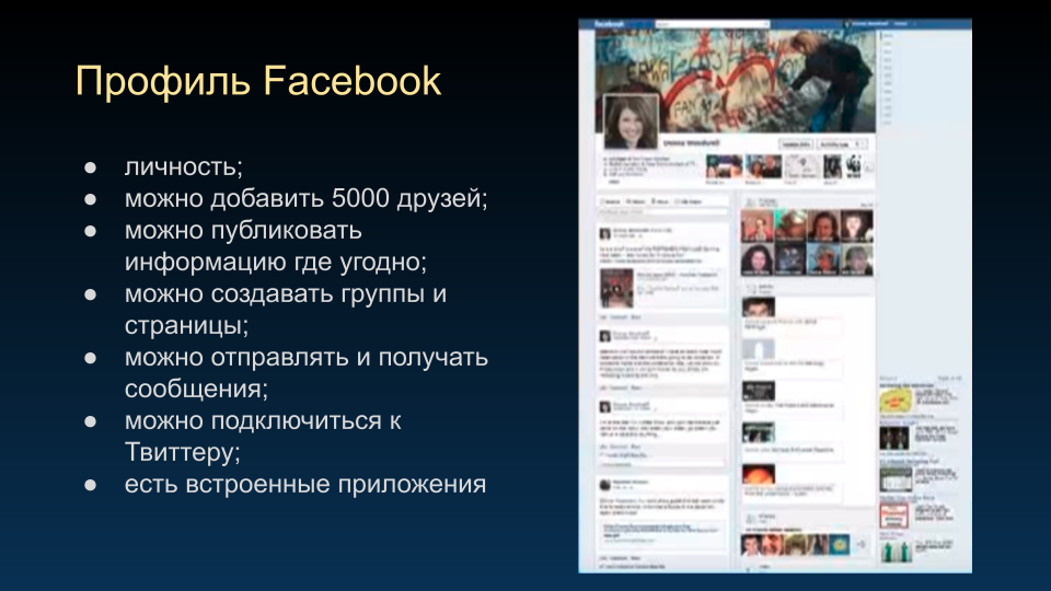 С помощью личной страницы вы можете размещать информацию от вашего имени где угодно – в личном профиле, в профиле своих друзей; на любой странице, которая вам понравилась; в любой группе, участником которой вы являетесь. Также вы можете создавать собственные группы и страницы, через которые можно отправлять и получать личные сообщения. Также вы можете связать свой профиль с Twitter, чтобы туда репостились ваши публикации. И вообще, есть целый ряд приложений, которые можно подключить к Facebook для расширения базового функционала.