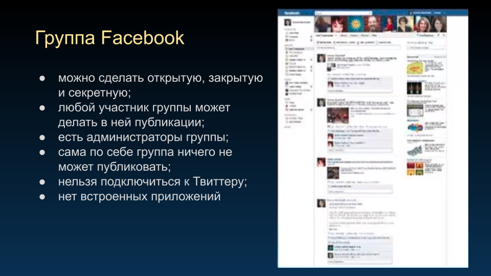 Группы в Facebook объединяют людей по интересам и позволяют создать синергию. В отличие от личного профиля, где только я могу постить на своей стене, и в отличие от бизнес-страницы, где только вы и ваши администраторы могут делать публикации, – в группе все её участники могут публиковать сообщения. В зависимости от активности пользователя, ему присваиваются почётные статусы.