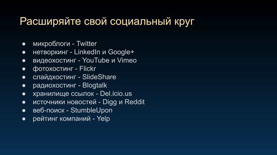 Когда вы соберётесь расширить свой социальный круг, то Twitter, LinkedIn, Google+, YouTube и Vimeo станут, вероятно, следующими крупными сайтами, которые вам пригодятся.