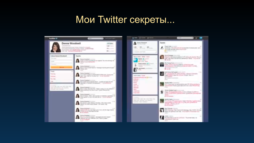 Поговорим о секретах Twitter13. Людей, которые залогинились в Twitter, вы увидите, даже не авторизовавшись там. И на вашей странице весь мир увидит ваши последние твиты. После входа в систему, Twitter превращается в новостную ленту, которая выглядит точно так же, как лента Facebook: там все люди, на которых вы подписаны, и все их публикации. Если хотите, можете стать моим фолловером. Не так давно я посмотрела на Twitter и спросила себя: буду ли я там что-то писать? Смогу ли я заниматься этим? И я там зарегистрировалась, потому что большинство астрологов (95%) используют Twitter.
