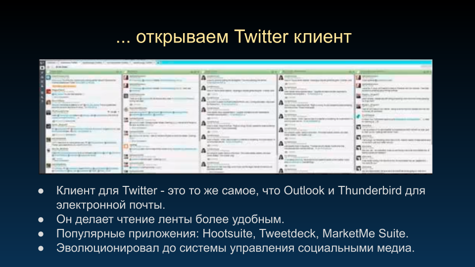 Если вы соберётесь завести Twitter, то вам понадобится программа. Так же, как мы не можем пользоваться интернетом без Google и читать почту без Outlook или Thunderbird, мы не сможем использовать Twitter без специальной программы-клиента. Она позволяет упорядочить вашу новостную ленту, потому что информация там приходит по нескольким потокам.