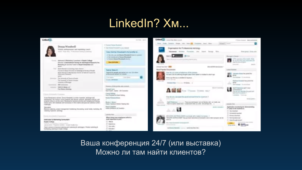 Поэтому я предлагаю вам зарегистрироваться в LinkedIn хотя бы для того, чтобы у вас там был профиль, по которому вас можно найти. Там можно размещать свои образовательные материалы, можно присоединиться хотя бы к одной группе, связанной с бизнесом, маркетингом и любой другой темой, которая вам, как астрологу, интересна. Думаю, это потенциально богатый источник междисциплинарной синергии. Типа "эй, астролог, пошли пообщаемся с лайф-коучами, узнаем, чем они там занимаются". Или, если вы деловой и финансово грамотный человек, то можете присоединиться к какой-нибудь инвестиционной группе и начать говорить на эту тему. Это хороший способ показать всем, что вы знаете, что вы делаете не так, как другие, и при этом получаете впечатляющий результат.