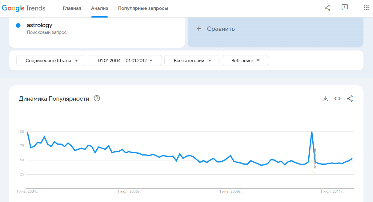 Как-то мы с вами смотрели, какое место в рейтинге Google занимает ключевое слово "астрология". И там сначала был такой низкий, низкий, всё время низкий плавающий график, а потом вдруг резкий скачок в январе 2011 во всём мире, и затем снова постоянный спад. Видели вы это или нет? Но Google действительно зафиксировал такую реакцию.