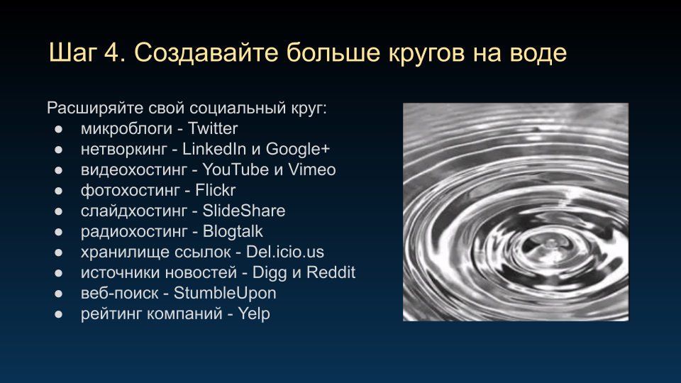 Можете загрузить на SlideShare свои презентации, сделанные в PowerPoint. Так же, как YouTube позволяет вставлять видео к себе на сайт, так же вы сможете размещать и презентации – в удобном для читателя виде. Это совершенно новый сервис, и я бы сказала, что очень много женщин используют его. Так что это хорошее место, где можно познакомиться с потенциальными клиентками. Это реально новый сервис, у меня даже не было возможности подробно его изучить и понять, как это работает.