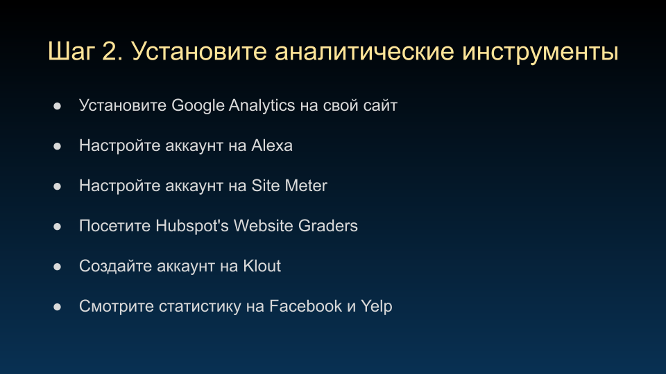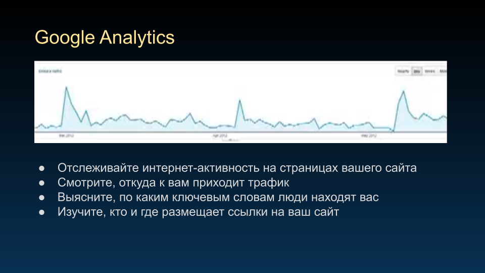 С помощью сайтов Alexa, Site Meter, Hubspot, Klout, Facebook и Yelp я могу показать вам некоторые примеры. Кто из вас знаком с Google Analytics? Окей, это великолепный инструмент для отслеживания интернет-активности вашего сайта. Он срабатывает каждый раз, когда на одну из ваших страниц приходит входящий трафик.