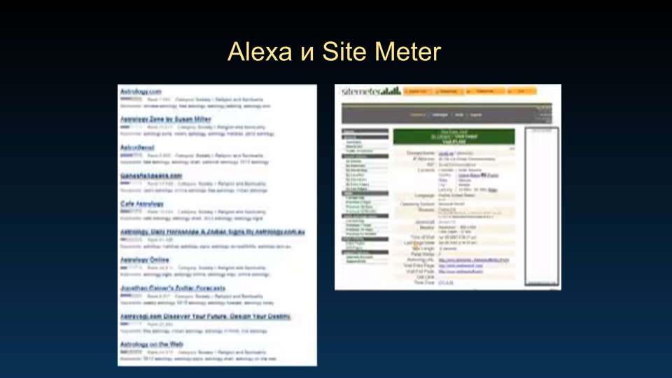 У Alexa есть система ранжирования, и она одна из лучших в мире. Если вбить там слово "астрология", то первым делом высветится astrology.com, и это неудивительно. Далее идёт Зона астрологии Сьюзан Миллер, Astrodienst… а мы там все внизу рейтинга. Если кликнуть по каждому из этих пунктов, то выйдет более подробная информация об этих сайтах, откуда трафик к ним приходит. Так вы можете изучить своих конкурентов и увидеть, что делают другие люди. Для этого нужно набрать в поиске Alexa названия интересующих вас сайтов, и она выдаст вам всю информацию.15