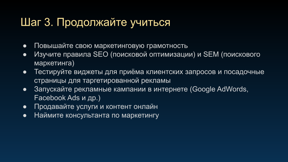 Однажды вы доживёте до того момента, когда уже начнёте рассматривать возможность найма работников, которые возьмут на себя часть всей этой работы. Ведь если вы не маркетолог, то вам придётся много читать, а денег вы из-за этого будете получать меньше, потому что сил на основную деятельность останется мало. Если вы всё-таки решите создать собственный сайт, то без веб-мастера вам придётся изучать HTML, а эти технические моменты очень трудно даются людям, не имеющим инженерного образования. Если вы будете выполнять всю работу сами, то это сильно усложнит ваши продажи и создание контента.