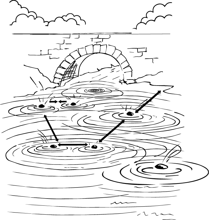 Рябь на прудуА теперь представьте, как вы или кто-то еще бросаете камень в пруд. Упавший в воду камень посылает рябь по всей поверхности пруда. Каждый из нас в своих воплощениях подобен бросаемым в пруд камням, и энергетики нашего Поля и жизни пересекаются с рябью от других камней, на которую мы – порой ведая, но обычно не ведая – воздействуем и воздействие которой испытываем.