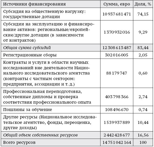 Вместе с тем выполнение положений Закона о свободах и ответственности университетов сопровождалось значительными финансовыми усилиями со стороны государства: университеты были освобождены от выполнения норм по сокращению государственных расходов, применимых к другим государственным операторам в контексте экономии бюджетных средств[26]. Выделение бюджетных и внебюджетных ресурсов высшим учебным заведениям, в частности в рамках программы «Инвестиции в будущее», финансируемой за счет основного займа, отражает приоритетное внимание, уделяемое высшему образованию и научным исследованиям. Однако финансовое положение университетов после их присоединения к программе расширения ответственности и полномочий в последние годы вызывает особую тревогу. «Доказанные финансовые трудности» и даже «риск неустойчивости в краткосрочной или среднесрочной перспективе» – это термины, которые использовала Счетная палата в мае 2018 г. для описания ситуации в некоторых университетах[27].