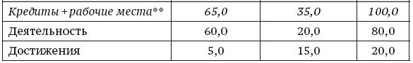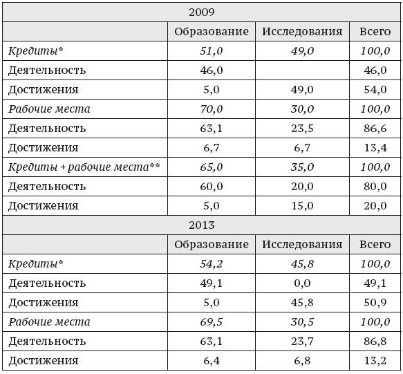 Логика такого финансирования заключается в том, чтобы найти баланс между деятельностью и ее результатами. Следует отметить, что введение части, касающейся результатов профессиональной подготовки, является новшеством; и хотя намерение поставить систему высшего образования в соответствие с утвержденными стандартами качества было единодушным, тем не менее возникли проблемы, связанные с его осуществлением. Следует напомнить, что университеты находятся в ведении государства и обязаны принимать и обучать студентов, на отбор которых они влиять не могут. Таким образом, основная часть финансирования образовательной деятельности должна учитывать фактическую деятельность учебных заведений. Она в основном зависит от количества студентов и содержания их образовательных программ. Две трети финансовых средств направлялось на образование, а около 20 % – на повышение эффективности (табл. 4).
