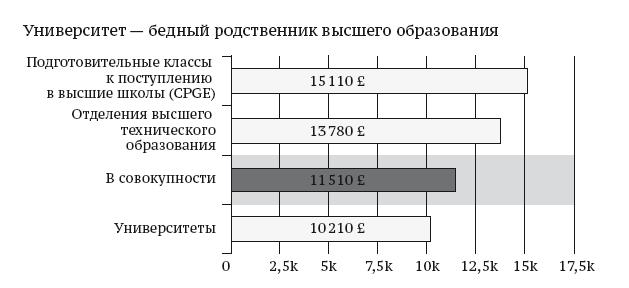 Раскол в системе французского высшего образованияФранцузский университет, хотя и является основой высшего образования, насчитывающей 90 тыс. преподавателей-исследователей, получает все меньше государственного финансирования. В 2016 г. на государственные программы, поступление на которые проходит по конкурсу (такие, как диплом техника высшей квалификации или подготовительные программы), были выделены гранты на одного студента в 1,3–1,5 раза выше, чем в университетах, что является самым очевидным показателем раскола французского высшего образования (рис. 3).