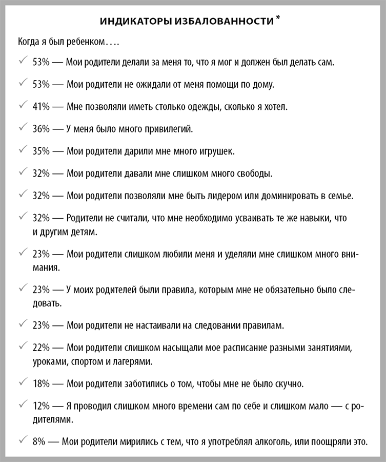 Наша книга основана на данных 10 исследовательских проектов по избалованности[1], в которых приняли участие свыше 3530 человек. Эти исследования показали, что такое избалованность, каковы ее эффекты, кто ее практикует и почему. Более того, исследования обнаружили прочную связь между избалованностью в детстве и отсутствием важных жизненных навыков и, наоборот, наличием нездоровых привычек и воззрений во взрослой жизни.