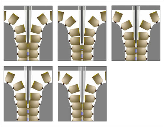 ● There is no traditional air shower as seen on ‘open parison’ machines. When not filling, the filling tips are retracted and reside completely within the extruder head and are flushed with sterile air. During filling, the filling tips are completely enclosed by the continuously extruding parison, which is sealed at the bottom by the continuous formation of the units. Throughout the whole time, the tips are surrounded by sterile air. Any loss of pressure inside the parison or not enough air entering into the parison will lead to a too small parison width. This will lead to filling being suspended and the needles will retract into the parison head. The sterility of the tips can therefore be maintained.