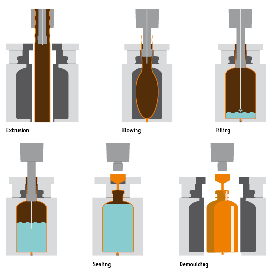 Fig. 2a Schematic representation of the closed parison Blow-Fill-Seal process.