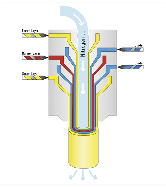 In addition, some machines also have co-extrusion capabilities, which can provide an additional barrier to oxygen and/or volatiles migration into the final container. It can also provide an additional barrier to reduce water loss out of the final container. A typical co-extrusion machine has 5 extruders (Fig. 3).