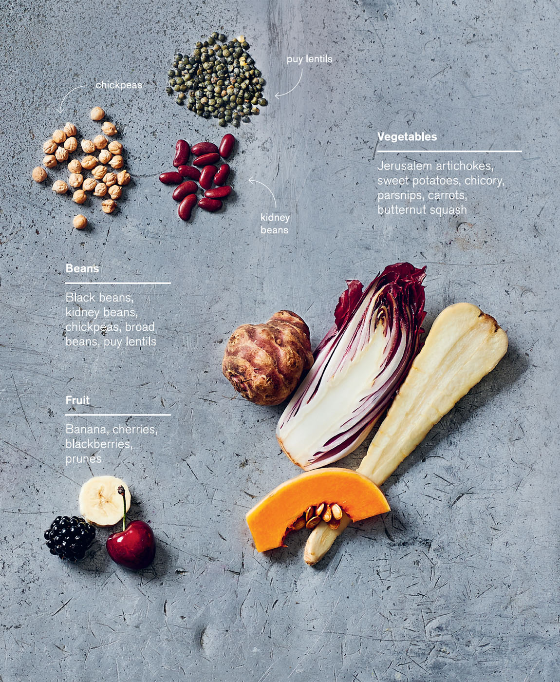 • Prebiotic foods are where the power is! These are specialised types of fibre that are indigestible by the human intestine, but our microbes are able to break them down. Prebiotic fibres essentially feed our microbes and keep them healthy. Not only are they cheap and accessible, they bring a wealth of different flavours and textures to a meal. Jerusalem artichokes, asparagus stem, flax, chicory, wholegrains and pulses are great examples of fibre-rich foods your bugs and taste buds will love, and this book is full of examples of how to get them into your diet. I make everything from stews, meatballs and roasts from these ingredients. This ‘health’ food is delicious and easy to incorporate into your way of eating. Plus, by generally increasing all types of fibre, we can potentially reduce the incidence of cancers, cardiovascular disease and inflammation of the bowel.46