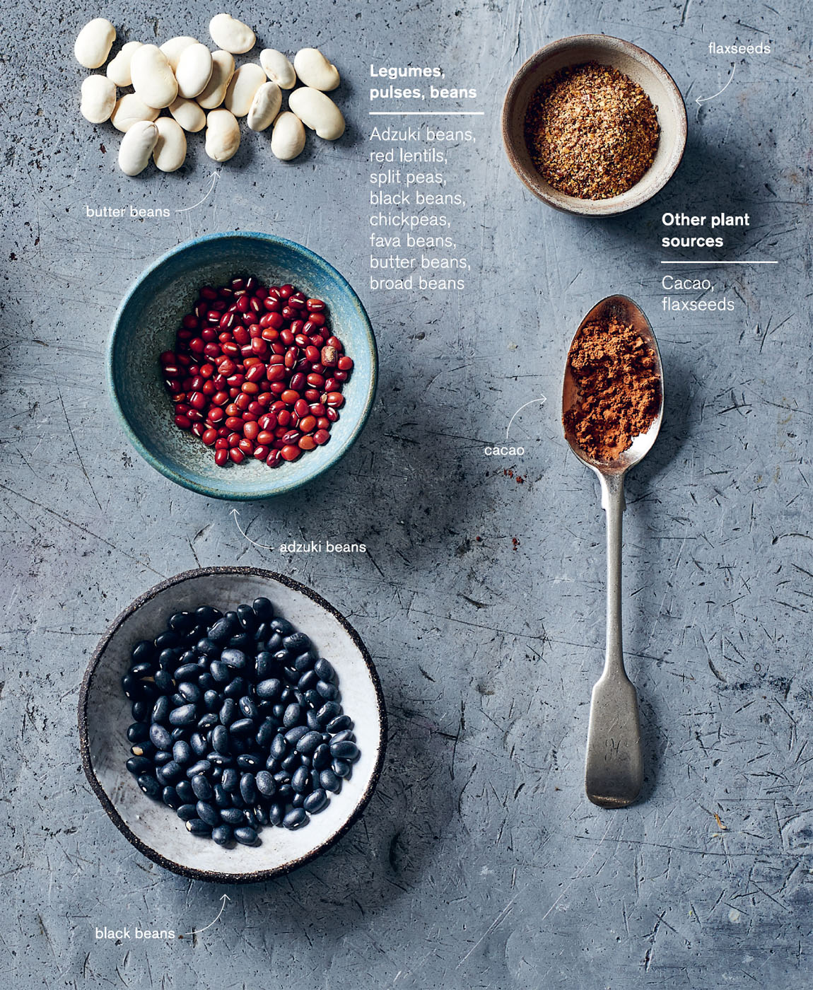 • Polyphenol-rich foods like cacao, dark green leafy vegetables, beetroot and green tea are richly coloured and intensely flavoured ingredients that bring a host of benefits to your body.54 Polyphenols are chemicals we find in plants of which there are literally thousands. Some of them have been shown to improve the gut lining, encourage growth of microbe patterns that are beneficial as well as have other advantages to general health. My recipes are designed to incorporate as many different polyphenol-rich foods as possible.