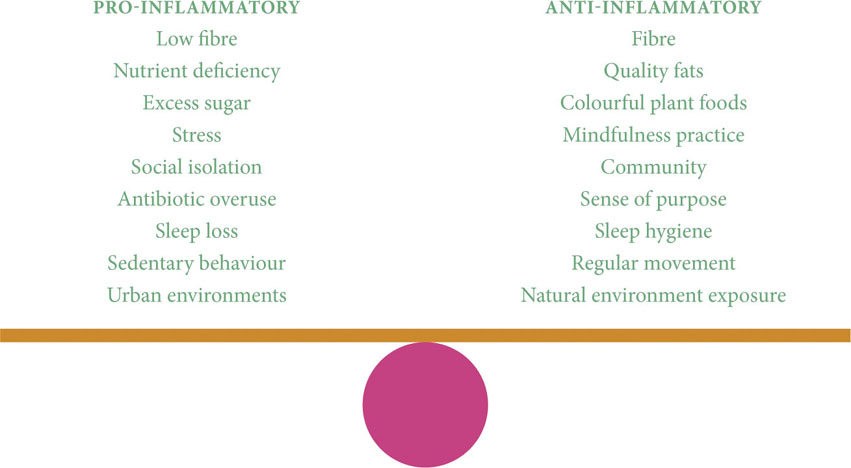 Examples of stressors potentially causing low-grade inflammation include excess sugar consumption, psychological stress, sedentary behaviour, accumulation of fat tissue and nutrient deficiencies (including vitamin D, Omega-3 and different micronutrients). Depending on our ability to tolerate these factors, the result can be low-grade meta-inflammation. This culmination of seemingly insignificant stressors can potentially tip us into a pro-inflammatory state, putting us at risk of the wide spectrum of conditions that inflammation is related to. This pro-inflammatory imbalance is what I will refer to as ‘inflammation’ for the rest of this chapter and what can be rebalanced with delicious foods and an enjoyable, healthy lifestyle.
