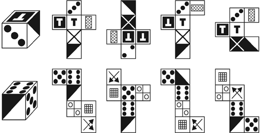 Для каждого из кубиков нарисовано четыре развертки, но только одну из четырех можно вырезать и сложить из нее соответствующий кубик. Найдите правильные развертки.