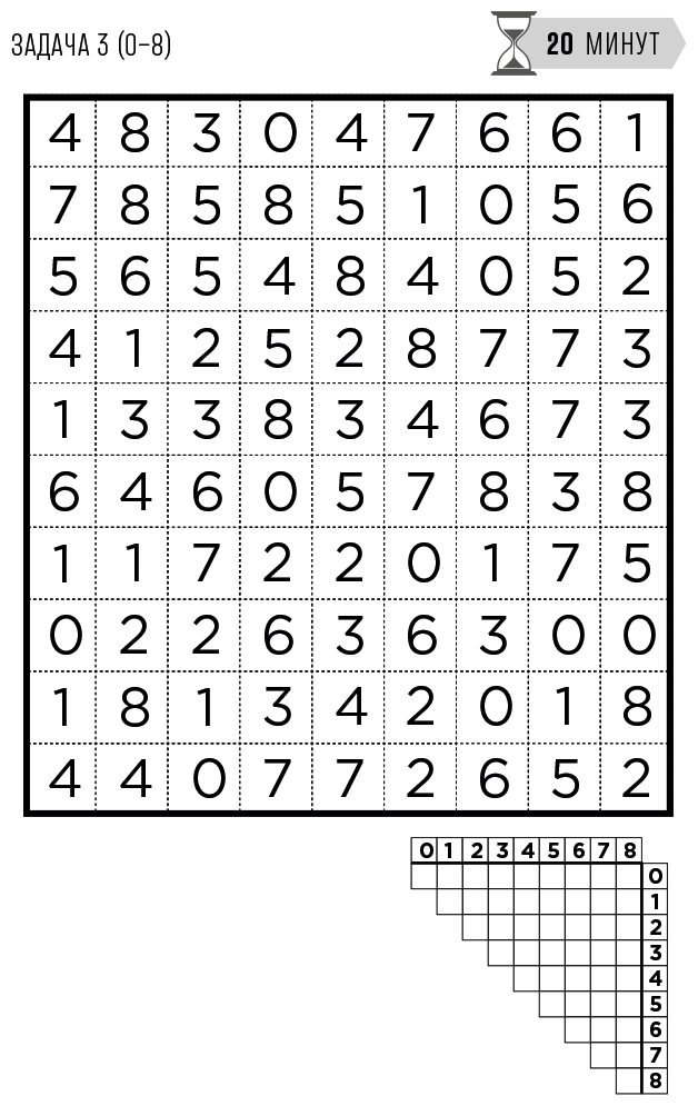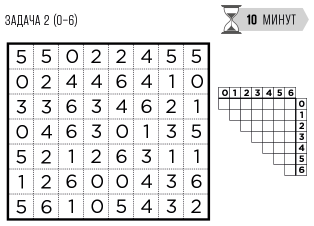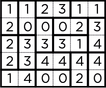 ПРАВИЛАОбведите пунктирные линии так, чтобы разделить всю сетку на прямоугольники размером 1 × 2 и 2 × 1 – «костяшки домино». В сетке должно находиться по одному экземпляру каждой костяшки, чтобы получился полный набор. Используйте контрольную таблицу, чтобы отслеживать уже размещенные костяшки. Цифра «0» соответствует пустой костяшке в обычном домино.