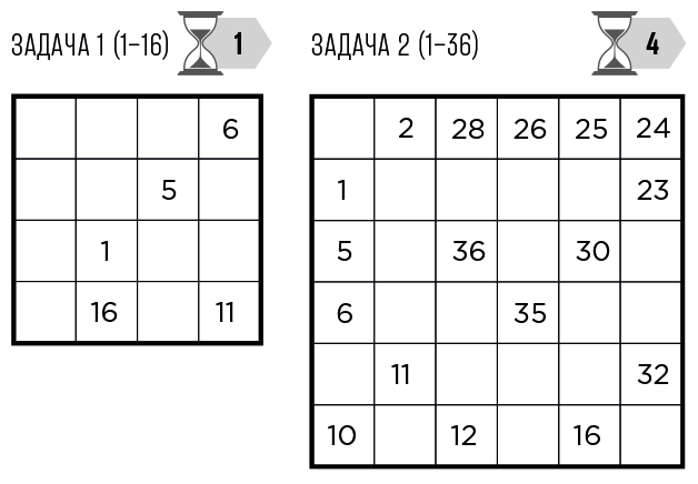 ПРАВИЛАЗаполните все клетки поля числами от 1 (конечное число зависит от размера поля в головоломке). Числа должны быть размещены так, чтобы образовать непрерывный «путь» от 1 до наибольшего числа, возрастая на единицу в каждом шаге. Числа не должны повторяться. Разрешенные шаги соответствуют ходам короля в шахматах – то есть влево, вправо, вверх, вниз или по диагонали на соседние клетки.