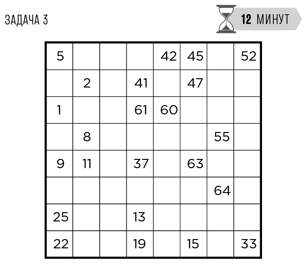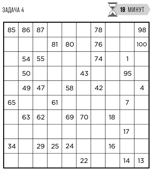 • Также поищите числа, которые разделены максимально возможным количеством клеток, – например, числа, отстоящие друг от друга на три числа, между которыми находится три клетки. В этом случае путь должен пролегать по прямой от одного числа к другому. Однако чем дальше друг от друга отстоят числа, тем больше между ними возможных маршрутов. Вы можете проложить между ними предполагаемый путь (пометив, что это предположение, а не окончательный вариант) и, отталкиваясь от этого, работать дальше.