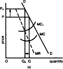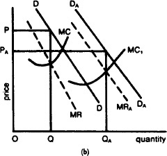 (b) The initial profit-maximizing price-output combination (PQ) without advertising is shown by the intersection of the marginal revenue curve (MR) and the marginal cost curve (MC). The effect of advertising is to expand total market demand from DD to DADA with a new marginal revenue curve (MRA). This expansion of market demand enables the industry to achieve economies of scale in production, which more than offsets the additional advertising cost. Hence, the marginal cost curve in the expended market (MC1) is lower than the original marginal cost curve. The new profit maximizing price-output combination (determined by the intersection at MRA and MC1 results in a lower price (PA) than before and a larger quantity supplied (QA). See BARRIERS TO ENTRY, MONOPOLISTIC COMPETITION, OLIGOPOLY, DISTRIBUTIVE EFFICIENCY.