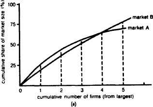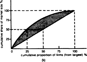 Fig. 28 Concentration measures. (a) Cumulative concentration curves, showing the cumulative share of market size accounted for by various (cumulative) numbers of firms. (b) The Lorenz curve shows the cumulative share of market size on one axis accounted for by various (cumulative) percentages of the number of firms in the market.