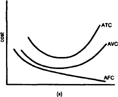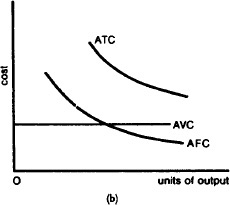 Fig. 11 Average cost (short-run). (a) The characteristic curves of average total cost (ATC), average variable cost (AVC), and average fixed cost (AFC), over the whole output range. (b) The characteristic curves of ATC and AFC and constant line of AVC over the restricted output range.