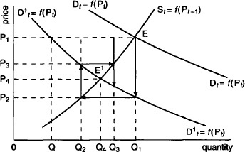 In year t + 1, and at price OP2, demand now exceeds supply by the amount Q1Q2, and in order to ration the limited supply OQ2 that is available, price will rise to OP3. This higher price in year t + 1 will encourage farmers to increase their acreage planted so that in the following year t + 2, a larger quantity OQ3 will be supplied, which means that in year t + 2 supply exceeds demand and price will fall below OP3, which will discourage planting for the following year, and so on. The eventual result of this process of adjustment is that a new equilibrium is achieved at E1 but only after a series of fluctuating prices in intermediate periods are experienced. See AGRICULTURAL POLICY.