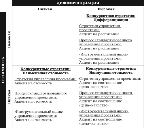 Конкурентная стратегия фирмы AWI абсолютно иная. Вместо того чтобы акцентировать внимание на отличительных чертах продукта и времени выхода на рынок (подход, столь ревностно проводимый фирмой Intel), AWI намеревается занять позиции ценового лидера в соответствующей отрасли (квадрант, соответствующий низкой дифференциации/низкой стоимости на рис. 1.3). Один из менеджеров AWI сказал: «Мы работаем в сфере производства строительных материалов уже более 70 лет. Технологические изменения не являются главным фактором в нашей отрасли – в отличие от способности предложить продукцию по более низкой цене. Чтобы развить эту способность и стать лидером в данной отрасли, нам пришлось рационализировать все производственные процессы, постоянно опуская целевую планку стоимости производства. Часть наших усилий была направлена на обеспечение управления снижением стоимости и разработку проектов развития производственных процессов». Подобное стремление к снижению стоимости заметно и в других, непроизводственных проектах фирмы AWI. Управление проектами как в производственной, так и в непроизводственной сфере ставит своей целью снижение их стоимости, что в конечном счете направлено на достижение ценового конкурентного преимущества.